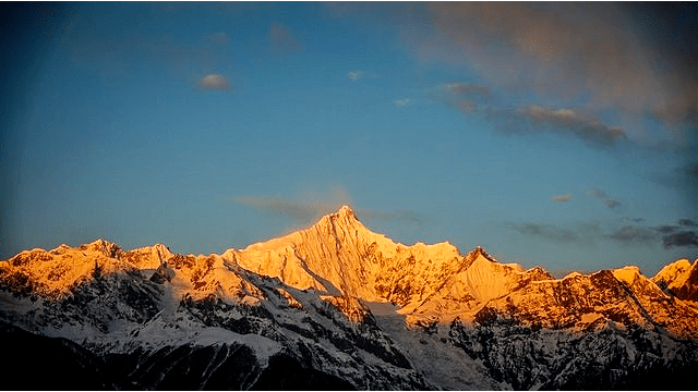 雪山顶呈“品”字形,冰川之下,数条瀑布炒年糕悬崖上如九天之水飞泻而下,与瀑布相接的是清澈的高山冰斗湖——友措神海(也叫玉石海)湖泊,红杉、碧草和各色的鲜花相得益彰。