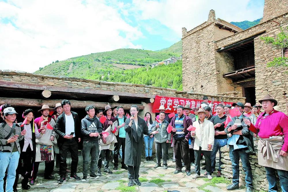 丹巴县干部群众在丹巴县红五军政治部遗址前聆听党史故事(图片来源:甘孜日报社)