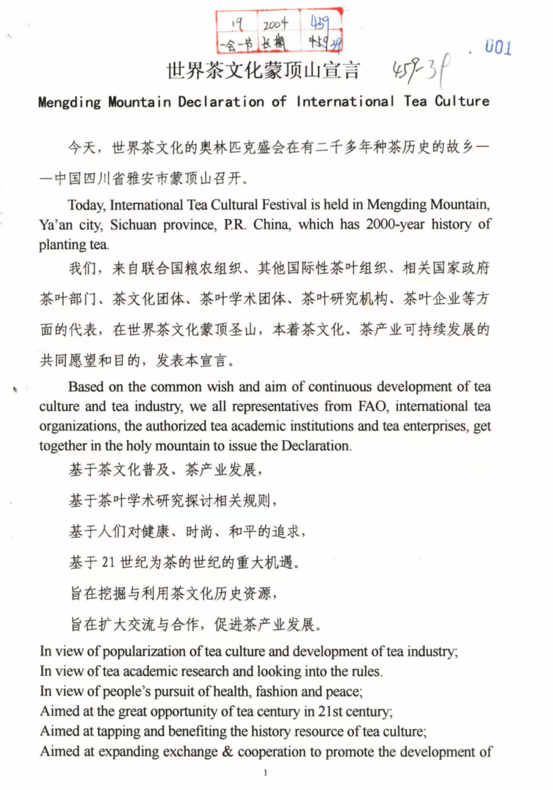 世界茶文化蒙顶山宣言(雅安市档案馆 藏)