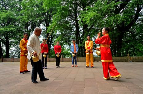 蒙顶山派茶技“龙行十八式”,是四川盖碗茶长嘴铜壶斟水技艺,属刚健派,在冲泡阶段表演。相传,北宋高僧禅惠大师结庐蒙顶山清修时,在习武过程中所悟出的铜壶茶技,被称为“千年活化石”。原只在蒙顶山僧人中流传,直到清末才逐渐传入民间。将铜质、壶嘴长达85厘米的专用提梁壶中的沸水在一米开外用十八个武术动作造型准确无误地斟入茶碗中,融传统茶道、杂技、武术、舞蹈、禅学、易理于一炉,每一式均仿龙的动作,刚劲有力,如行云流水,一气呵成,充满玄机妙理。表演时配专门音乐或《精忠报国》等豪迈、雄浑的音乐。