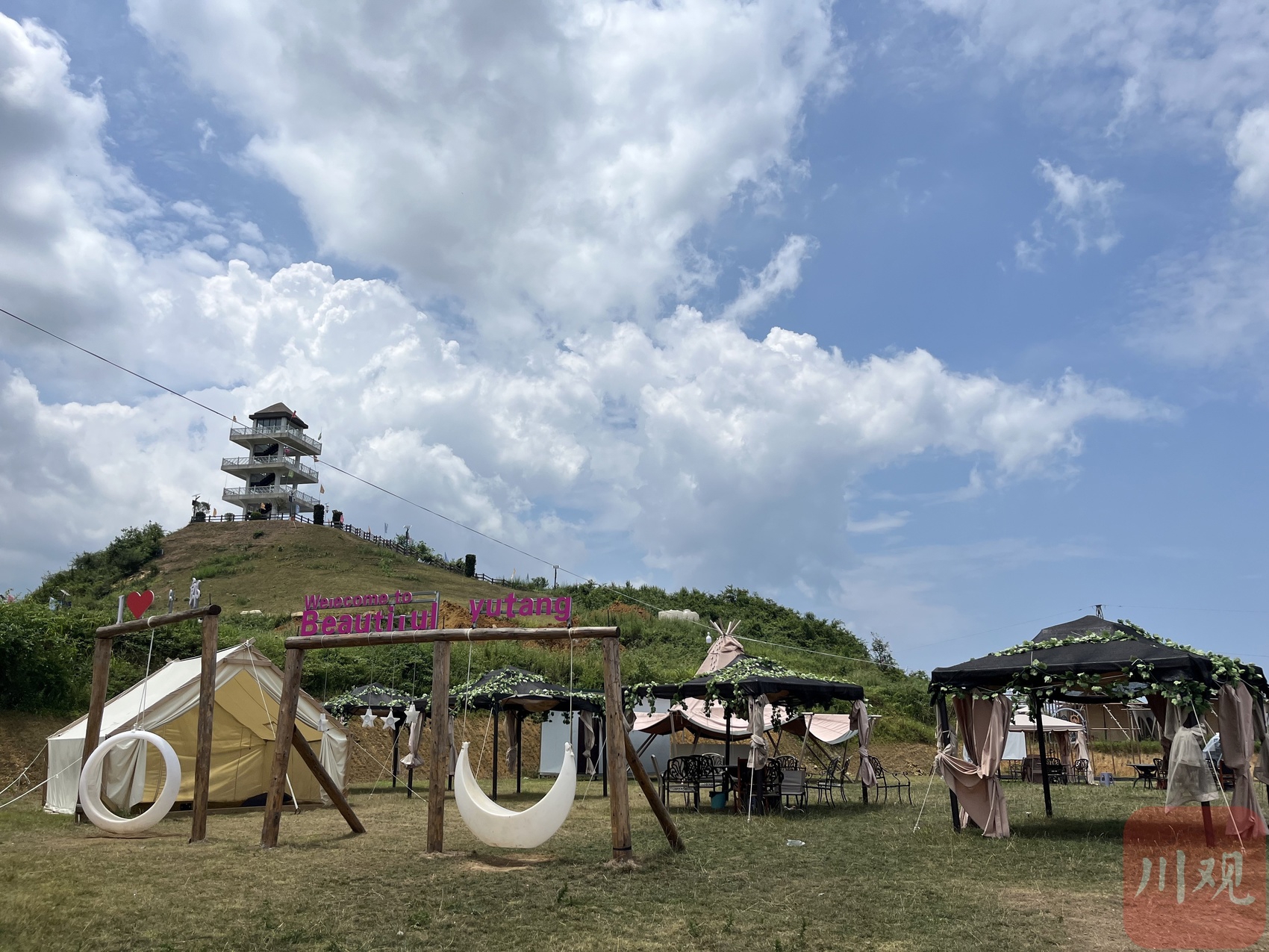 8月5日16时起,炎热的高温逐渐褪去,依山而建的鱼塘村文旅融合基地便开始热闹了起来:山地露营基地、儿童乐园、民宿餐饮……每个板块陆续有游客前来,其中不乏诸多说着贵州话和普通话的外地游客。