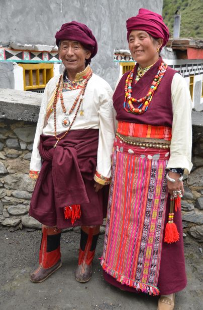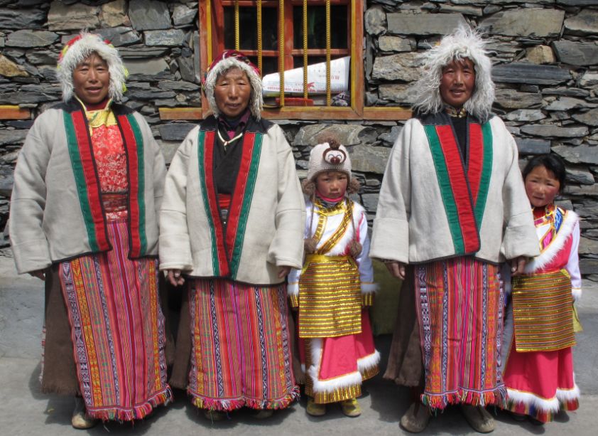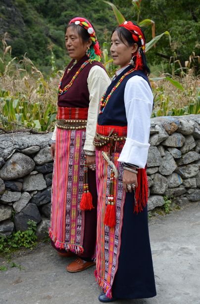 普米女子服饰。普米女子的内上衣大多用棉布制成,且喜用白、黑、红、粉红等多种颜色;右面开襟,下襟较短,窄袖高领。外衣有短衫(白色对襟或右面开襟,领口、袖口及衣服边上绣有独特花纹)和长衫(右面开襟)两种,劳作时喜穿羊皮褂。夏季,普米族妇女下身着 “甲里”(百褶筒裙),中老年妇女一般穿“甲里”或“巴几”(连衣裙)。普米族女子喜用红、蓝、酱等多种颜色的丝线合拌搓辫成一根长辫子,先挽在头上,固定好后在耳边吊有10公分左右的红头须,背后吊有20公分左右的红须;多数中青年妇女头戴红头绳,较富裕人家的女子戴“库综素”(红头绳上配有砗磲、珠宝、象牙、金银等);喜穿“嘎得追”(特殊材质做成的鞋子),冬天普遍戴“宗克布袋”(羊羔皮做里子,用红、黄色布料镶边织成的饰物),佩饰有手镯、戒指、胸链、彩带、耳坠、银环和红、白色珠饰等。