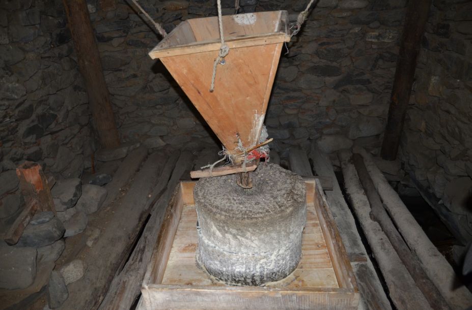 水磨房。九龙普米仍将水磨房建在河边或水流量较大的水沟边,为两层,房内安装石磨。上层放置石磨、粮斗、磨盘,下层置依靠水流冲击转动的水车板。石磨由两层磨扇构成,之间设有一起一伏的磨齿;粮斗成锥状,下方设有一小孔,小孔对准石磨的磨眼,粮斗上栓有一根木棍,磨扇转动时带动木棍震动使粮食有序进入磨眼;磨盘为方形,用于放置石磨,磨出的面粉洒入其中。水磨的动力部分是立式冲击式水车板,立轴与石磨上磨扇相连,流水冲动水轮带动上石磨转动;上、下磨扇中间装有燕尾铁立轴,下磨扇中间设有相应的空套;两个磨扇结合以后,下磨扇固定不动,上磨扇绕轴转动。