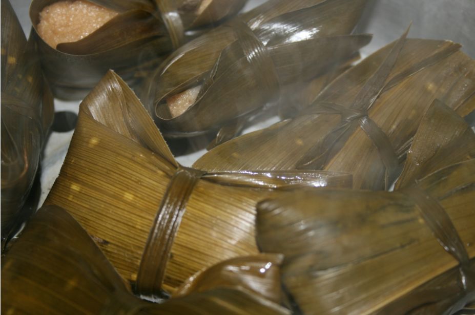 枕头粑是将香糯米、红豆、黄豆、红沙糖加工后用粽叶包成的食品。