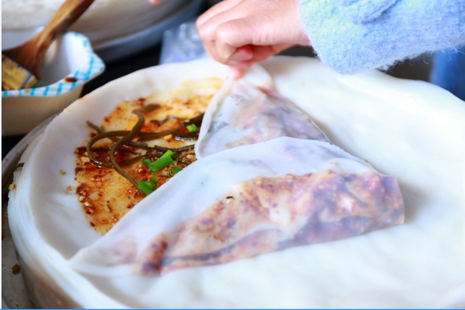卷粉制作技艺:将一级香米浸泡24小时,打成米浆,加上优质牛奶、豌豆粉、白糖,装入特制的盘子,在水里蒸1—2分钟成形。将配制的大头菜、鸡枞油、海带丝、红椒油、花生油,卷在一起,即可食用。