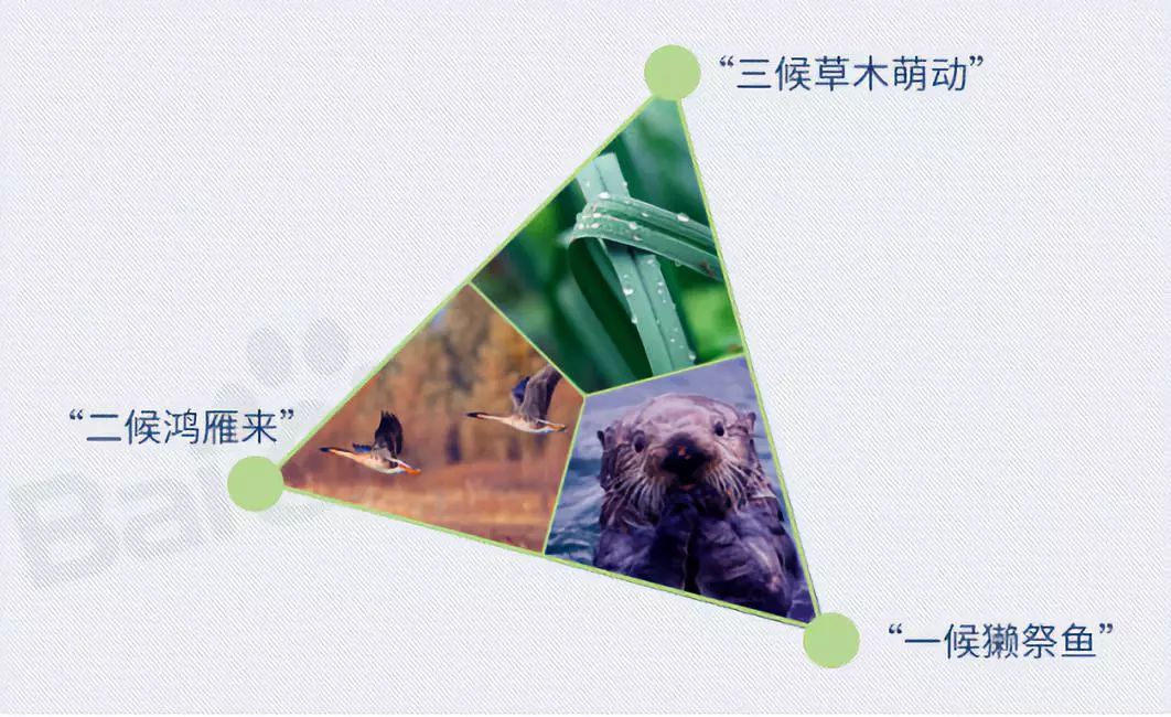 古代将雨水分为三候:“一候獭祭鱼;二候鸿雁来;三候草木萌动。”这个节气过后,大地一派欣欣向荣。如在《逸周书》中就有雨水节后“鸿雁来”“草木萌动”等物候的记载。