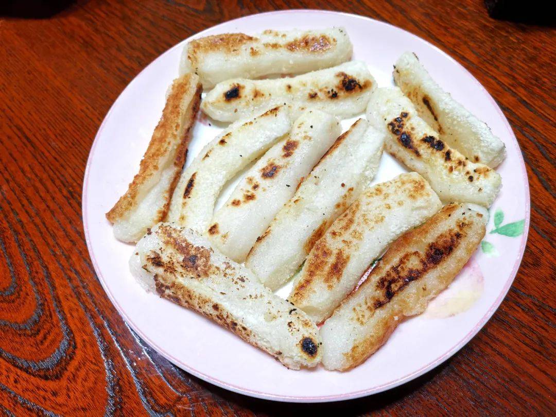 看我狼吞虎咽的样子,父母慈爱地笑了,他们说:“不要急,尝点就够了,这还只是糍粑最初始的状态,真正的糍粑才更好吃。”我这才发现,父亲正在把这些糍粑分成无数小块,然后再把每一小块均匀揉开,摊成一个个大小适中的圆饼子。母亲从中拿出一块,用刀子切成一块块小长方形,这时父亲已再次点燃了灶火,母亲在锅里放入油,一块块放入切好的糍粑,香浓的味道在“嗞嗞”声中弥漫了整个厨房。煎至双面黄后,母亲将糍粑盛入盘中,洒上大豆芝麻粉端上桌子,我们全家围坐一起,愉快地享受起劳动成果。此时的糍粑,外焦里嫩,比起先前的满口清香,更多了一份香浓。
