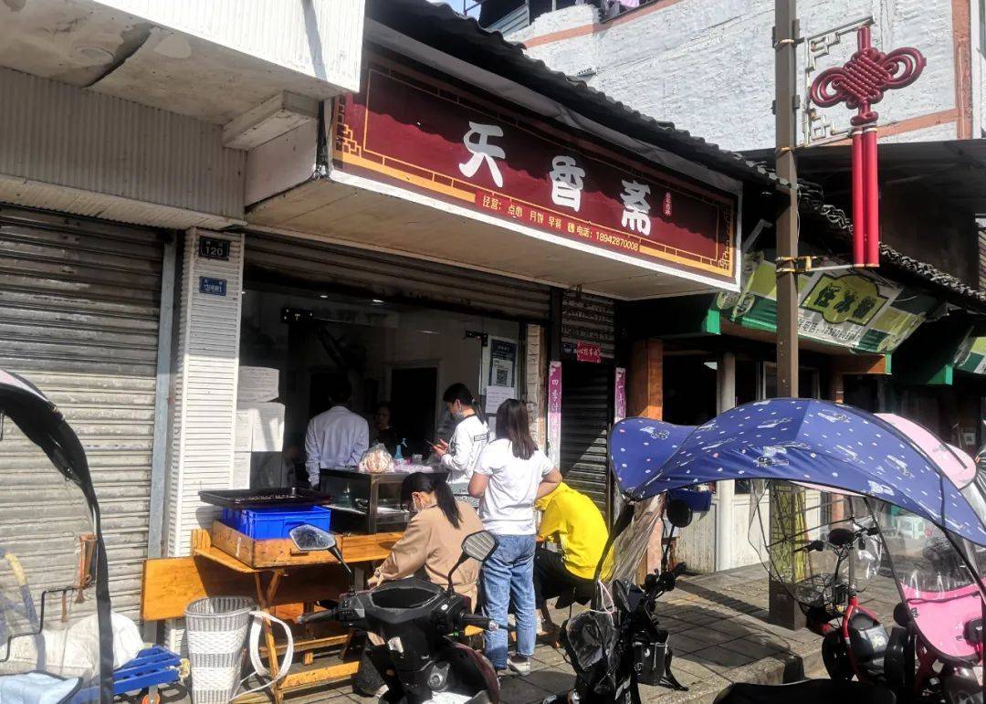 大隐隐朝市。天香斋,坐落在老城南街一处不起眼的小门店。门店之小,一不留神便会错过。泛黄招牌是岁月斑驳的印记,百年老字号天香斋饼中盛满百年的月光。