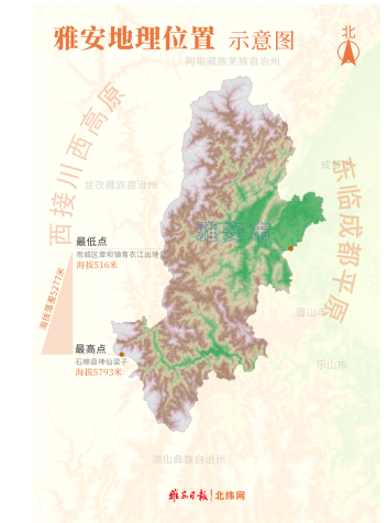 雅安位于“不知饥馑”的天府之国西南部,海拔落差达到5000米以上,全市辖区面积15046平方公里,作为“华西雨屏”的大相岭,将这片土地划分成南北两个自然地带。