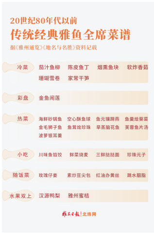 1951年,雅安修筑康藏公路(现川藏公路)时,西南交通部在雅安建成了西南交通旅行社,从成都、重庆等地抽调名厨,供应特制“砂锅雅鱼”和“雅鱼全席”。
