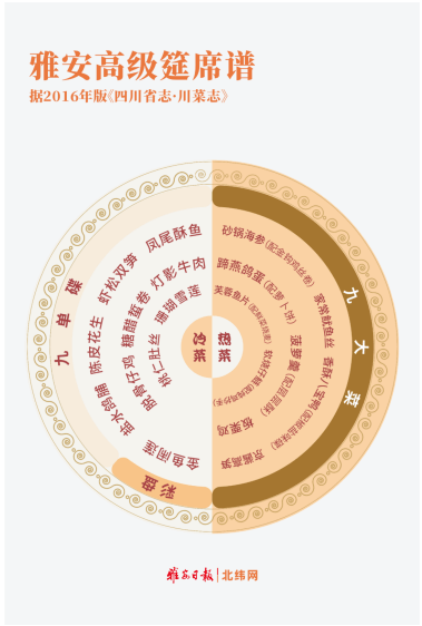 《雅安县志》载:“宴客昔人用五宾盘,嫌其简也,易为九碗席,踵事增华,易为燕粉席,再易为参肚、为鱼翅。”