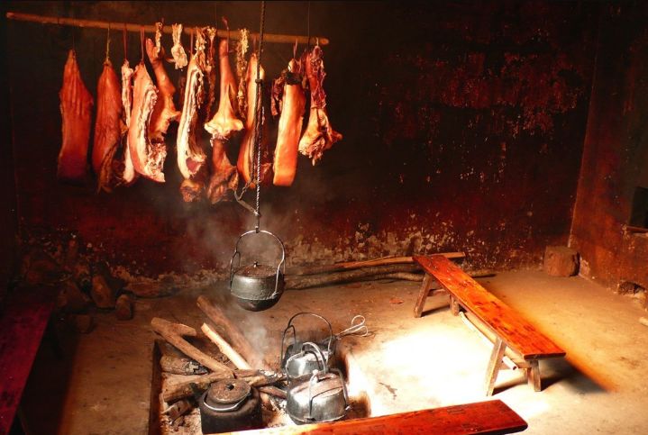 山里人的熏棚,往往就是一间土屋子,屋子里挖一个火坑,火坑上搭着木棍架子,腌渍好的肉就疏密有致地挂在架子上。为了熏腌出乡野风味浓郁的腊肉,要准备一大堆松丫柏枝。