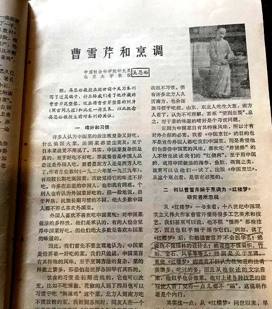 吴恩裕在这篇文章里讨论,何以曹雪芹娴于烹调为《红楼梦》研究者所忽视?吴恩裕说,读了《红楼梦》后,你能说曹雪芹不会医学吗?能说他不懂园林设计吗?能说他不懂编织竹刻、金石、风筝等等吗?特别是关于烹调,更是《红楼梦》的读者不但认为他知道的佳肴美馔多,吃过的多,而且从他叙述的文字看来,他似乎也会做菜。