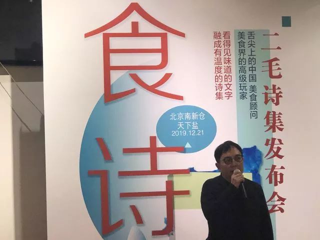 这是一个活色生香的下午,2019年12月21日,二毛的诗集《二毛美食诗选》在北京南新仓天下盐举行新书发布会。诗人赵野说:“二毛的美食诗,有情、有癖、有色、有禅、有历史、有乡愁、有世故、有机锋、有臆想、有幻觉,整个一桌子的满汉全席和感观盛筵。”