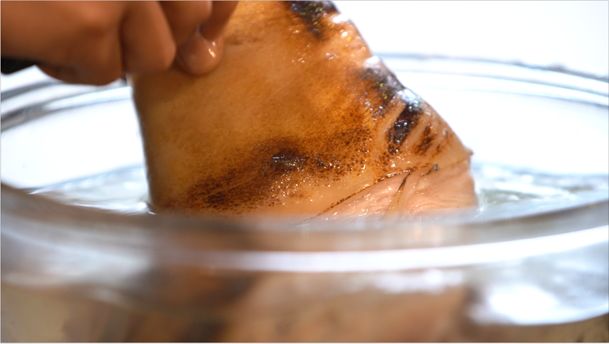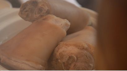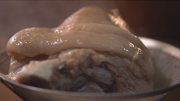 为了保证东坡肘子细腻润滑的口感,要将肘子皮上的猪毛清理干净,这一环节至关重要。