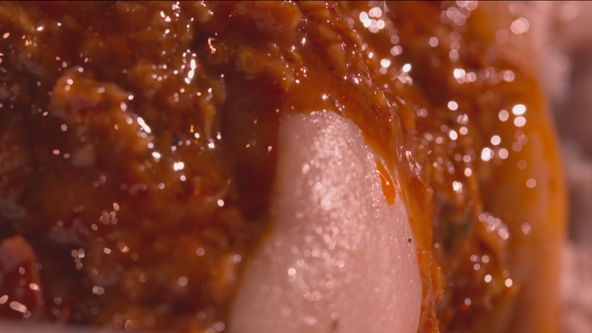精心炒制的酱汁,往刚出蒸笼的肘子上一浇,立刻弥漫出一股浓郁的肉香,东坡肘子大功告成。