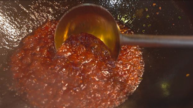 东坡肘子的最后一步工序是用酱汁,豆瓣酱,姜末炒出香味后,加一勺高汤翻炒。随后加入盐、白糖、酱油、醋、花椒面和葱,继续炒制几分钟,最后,加入香油。