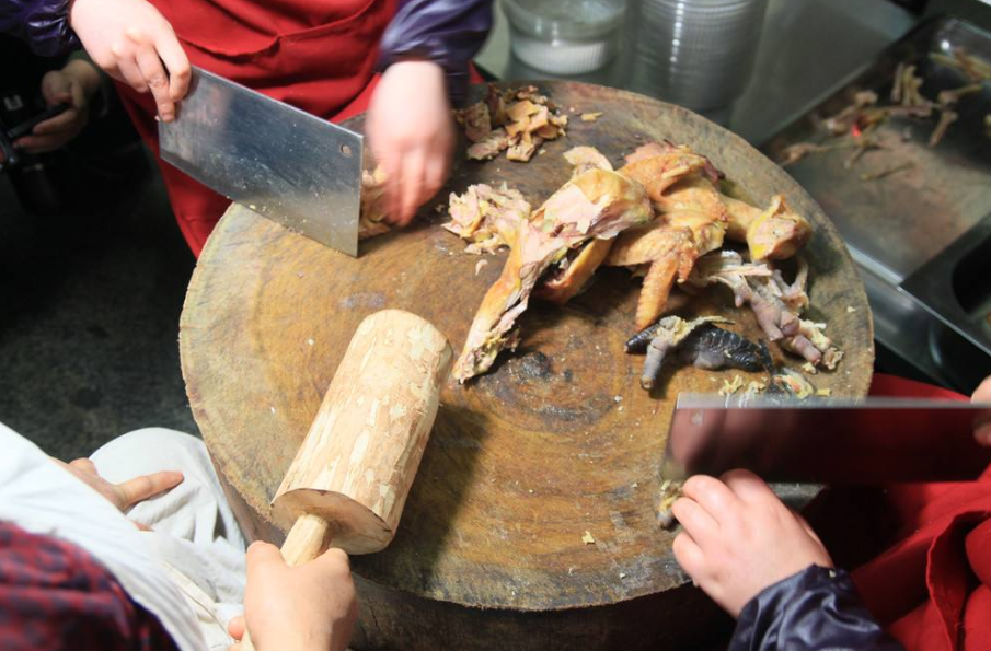 客人挑好鸡肉,宰鸡大片旋即在厚重的大菜墩上演。只见一人掌刀,一人使棒。刀架于鸡上,尺长圆棒敲击刀背,棒起刀落,肉片款款叠列,皮肉相连,刀刀见骨。刀者决定肉的厚薄,棒者助力宰鸡,二人配合默契,鸡片方能薄而有型。这便是“棒棒鸡”名字的由来。