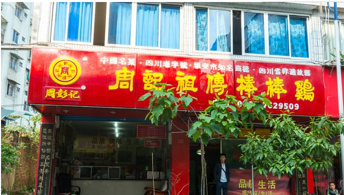 “周记祖传棒棒鸡”是一家百年老店,是荥经最硬火的老字号。单看门店,就知其博大精深。招牌由古朴浑厚的隶书写成,出自本土知名书画家刘继铭的手笔。对联“艺创满清,集百家成一绝敢当四川老字号;道征殊俗,开三秀和五洲无愧中国名菜肴。”是荥经文化名人吴阿宁对老店厚重传承的提炼。墙上挂满金字牌匾:“中国名菜”“四川老字号”“四川省非物质文化遗产名录”等。以中央电视台为代表的主流媒体多次来荥经拍摄“周鸡肉”,让荥经棒棒鸡家喻户晓。