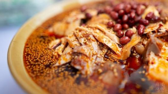切好鸡肉,看店主勾兑汤汁,没有不咽口水者。空气中麻辣葱笋的香味,弥漫成特有的棒棒鸡香。