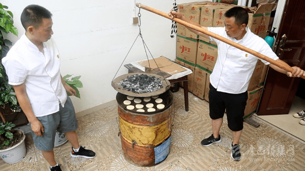 用酥皮包裹好馅料,放入模具内压紧压实。点心脱模后在点上属于“周聋子点心”的独家标记(四瓣花),便可进入烤制流程,烤炉分为上鏊与下鏊。首先将吊炉上下火都提前预热至250°左右,然后把制作好的点心正面朝下放在吊炉里,最后将上鏊移入吊炉上方,进行点心的烤制。根据经验确定烤制时间,当吊炉里飘出香味后,即可将上鏊挪离吊炉。点心背面呈现出“偷油婆色”(焦黄色)后,迅速将点心翻面,继续烤制成褐色,出炉即可食用。