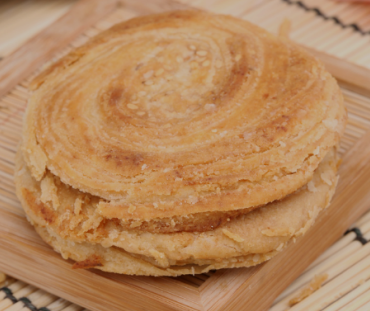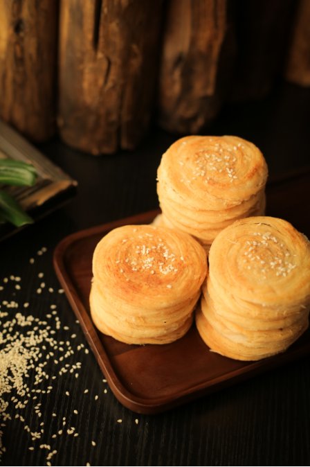 所有材料备齐后,就进入制作环节。先是将搅拌好的面料切成小块。为确保规格一致,需对每一个面块称秤。切好的面块,用擀面棒擀制成圆饼状态,加入油酥后包起来,双手不停地转、搓、压,制成饼胚,沾上芝麻。再将饼胚擀制直径10厘米至12厘米、厚约6毫米至8毫米的圆饼,装入专用的烤盘,再上油进入烘烤箱。三四十分钟后,即可出烤箱,晾冷后用专用纸吸油,再放入包装袋,或直接食用。