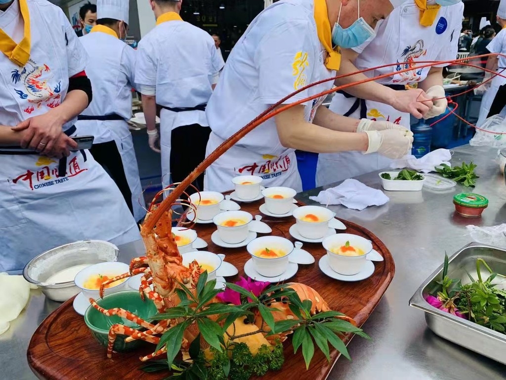 随着比赛的进行,一道道美食由机器人传送至美食专家品鉴区,参评菜品由评审专家组根据评审标准对参评企业进行集中评审,通过资料审核、视频展示、菜品品鉴等环节,最终评选出了20道人气高、口碑好、具有代表性的“双流名菜”。