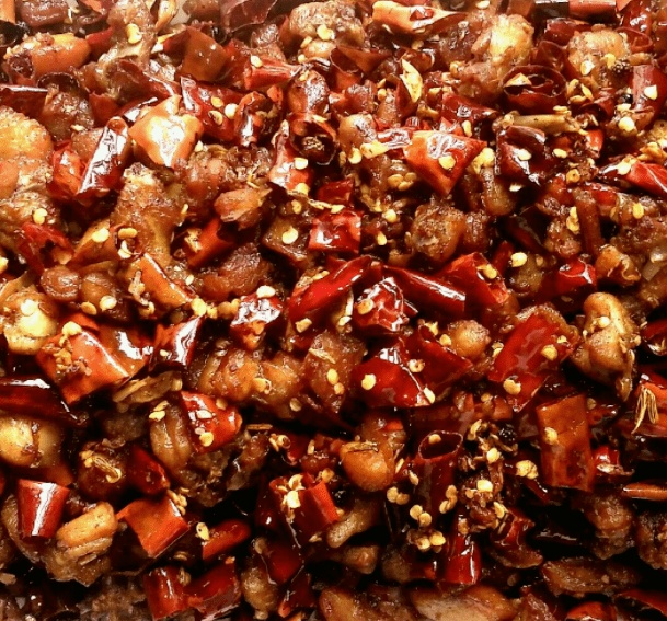 半个时辰,伙计将牛肉、佐酒菜肴陆续端上来。稍后一大盆兔肉上来便立即吸引了大家,只见油色红亮,肉块指头大小,金黄略白的肉丁多数带骨浸泡在红亮的汤汁中,肉和汤上有一些芝麻,红艳的辣椒平添几分温度。盆中点缀的几片翠绿香菜。香气透过腾起的热雾沁入心扉,让人垂涎欲滴,饥肠辘辘。崔玉贵挑一块肉丁放入口中,顿觉微辣还略烫又不失鲜麻,口舌生香,那不带骨头的肉绵而不柴,带骨的肉细滑而脱骨,那肉质也十分鲜嫩爽口。众人吃得甚是欢畅,崔玉贵满足地翘着兰花指品着茶,感觉嘴皮因麻辣而还在轻微跳动。凭窗眺望江面夜色,渔火盏盏,码头千帆齐聚,灯火辉煌。吹着沿山而上的江风,顿觉惬意,一路的劳顿一扫而空。