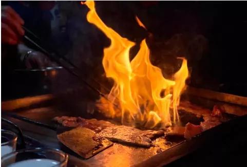 当炭火在铁板下燃烧,铁板上的肉会随着油温“滋滋”作响,坐在一旁帮忙烤烧烤的店员总是能掌握到合适的火候,而一旁坐等吃肉的顾客,不时拿出手机拍照,记录下食物在火中“起舞”的画面。