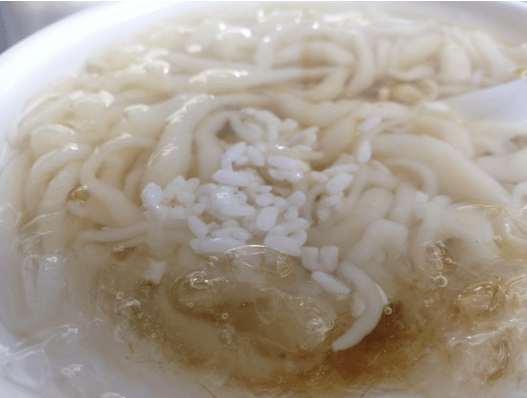 凉虾制作并不复杂,将米粉、面粉按一定比例用特制碱水调成粉浆,再将粉浆用铁锅煮至粘糊状,然后倒到大漏盆中漏入凉水中形成。因头大尾细形似小虾和小蝌蚪,故取名凉虾。不过,虽然做法大同小异,但是口感确各有不同。真正好吃的凉虾,还是有它的小秘诀。