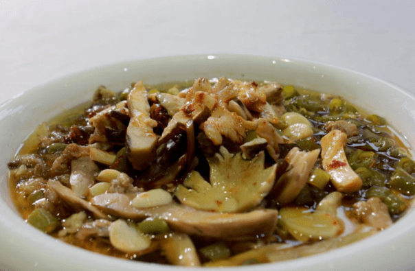 洪雅斗鸡菇和仁寿不同,采用油炸的方式。斗鸡菇来自洪雅本地出产的新鲜、成熟的斗鸡菇为主料,菌菇细嫩,比鸡肉还鲜。用蒸的办法突出食材本身的鲜味,配上猪油渣蒸熟,让成熟的斗鸡菇鲜香四溢,再加上青椒的清辣,减少了油腻感,是当地人见人爱的美味佳肴。