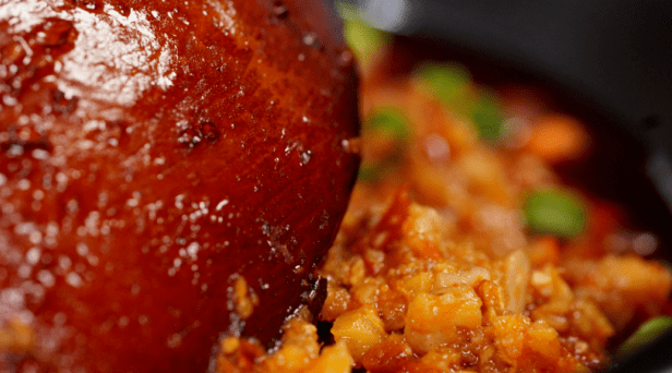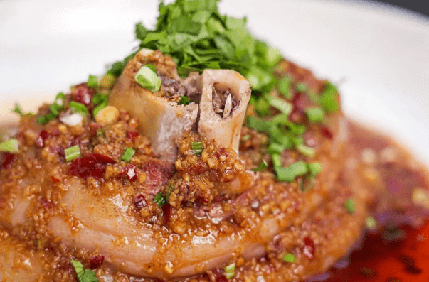 当地将眉山东坡肘子的味与杭州东坡肘子的形、色相结合,配上一碟独门蘸料,肥而不腻,耙而不烂,彩金黄、皮脆芳香,让人回味无穷!