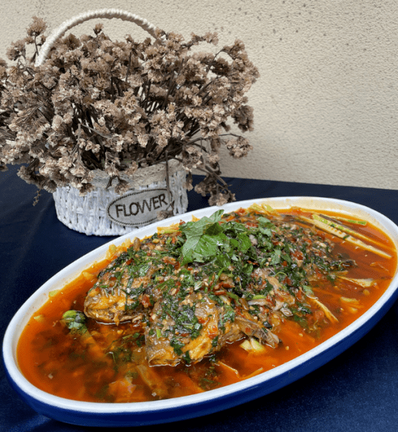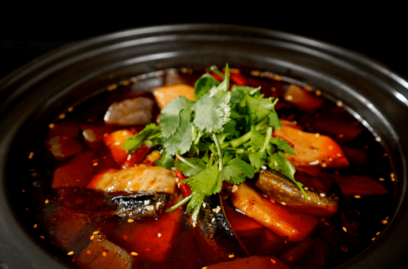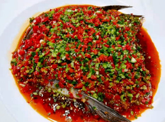 全鱼宴剁椒鱼头取自黑龙滩深水鱼头,剁椒里面含有辣椒碱与辣椒素,辣椒素不仅可产生辛辣的口味,而且富含维生素E、维生素C等营养成分,具有促进血液循环、延缓衰老、预防多种疾病的作用。
