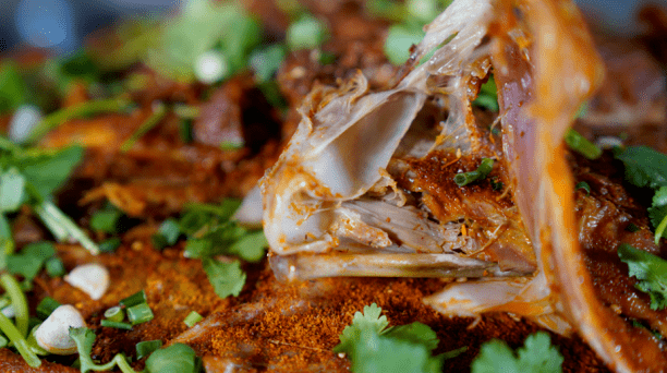 川派烤全羊加工流程复杂,调味细节考究,优质的新鲜羊肉经过十几道工序的秘制调味,再经过长达5小时的低温慢烤,达到外焦里嫩的完美平衡,具有辣而不燥、鲜而不腥、入口窜香、回味悠长的特点。