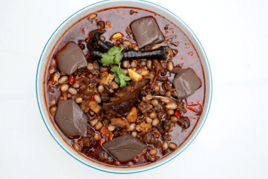 藤椒钵钵鸡源于三国时期刘备入川,为了防止匈奴侵犯,派兵驻在洪雅一带,士兵们常去山林里摘来野生藤椒果放在土钵里,然后放入烤好的鸡肉,经过几十代人的传承,才变成了今天的样子。藤椒钵钵鸡咸鲜清香,微辣微麻,是一道特色招牌菜。