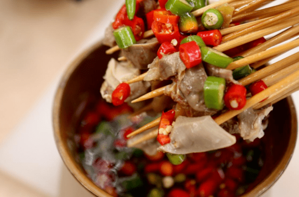 这是典型的四川凉菜,历史悠久,做工考究。此菜原始于青神汉阳镇,取用农户散养土鸡,经煮熟后,把鸡肉敲打均匀,加入佐料而成,故取名棒棒鸡。
