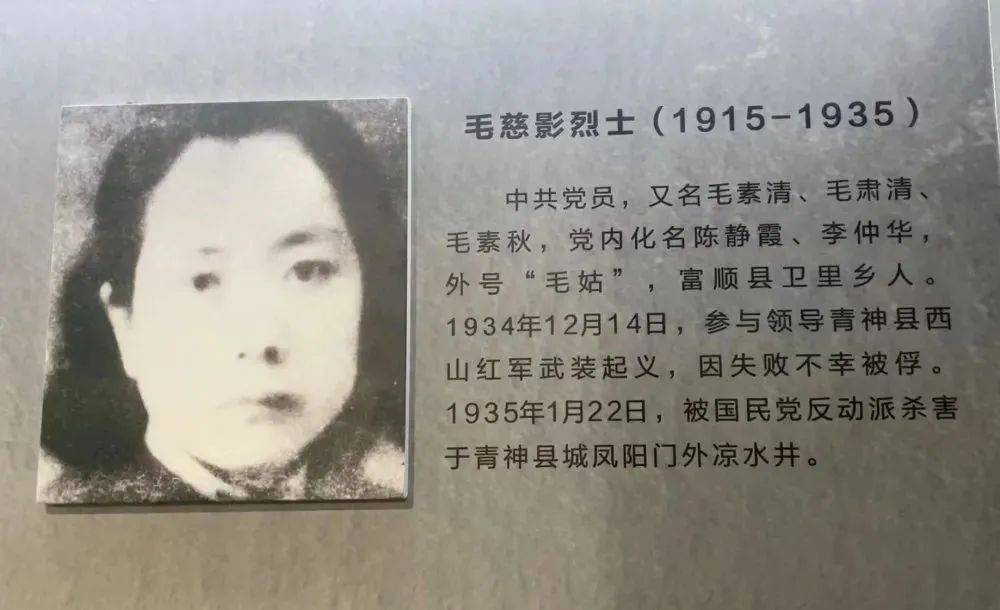 毛慈影烈士(1915-1935),又名毛素清、毛肃清、毛素秋,党内化名陈静霞、李仲华外号“毛姑”。1934年12月14日(夏历冬月初八),她参与领导青神县西山红军武装起义,因斗争失败不幸被俘。1935年1月22日(夏历腊月十八日)被国民党当局杀害于青神县城凤阳门外凉水井(今青神县东门外),年仅19岁。