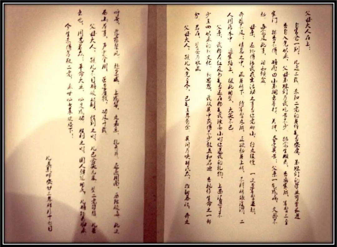 父母大人,孩儿入党至今,已是五年有余。期间为唤醒民众,推翻暴政,奔走呼号,露宿餐风。赴荣威、上成华,走嘉乐、扎青井。迹遍川南,历险颇多。此次西山举事,声震全川,虽遭屠戮,功及千载。