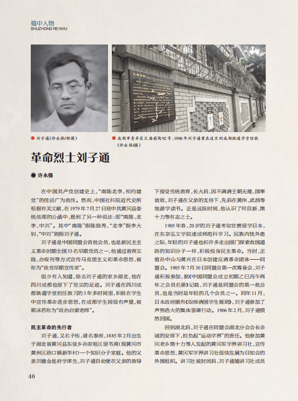 很少有人知道,除去刘子通的家乡湖北,他在四川成都也留下了坚实的足迹。刘子通在四川成都铁道学堂担任教习的3年多时间里,积极在学生中宣传革命进步思想,在成都学生间很有声望,被郭沫若称为“政治启蒙老师”。