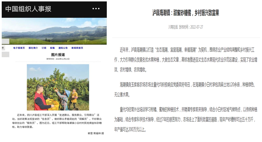 2016年6月,泸县海潮镇良玉种养殖家庭农场在海潮镇小白村正式下苗,品种为金秋砂糖橘。农场主童代均是地地道道的农村人,年轻时从事建筑行业,挖到了人生的第一桶金。2015年,他看到地方政府号召返乡创业的宣传,就回到家乡海潮镇,成立了家庭农场,开始带领家乡父老走在了创业路上,为家乡经济建设作出了积极贡献,2021年被泸县县委、县人民政府表彰为“农民工建设泸县先进个人”,个人创业故事受到学习强国、中国组织人事报、川南在线等媒体关注。