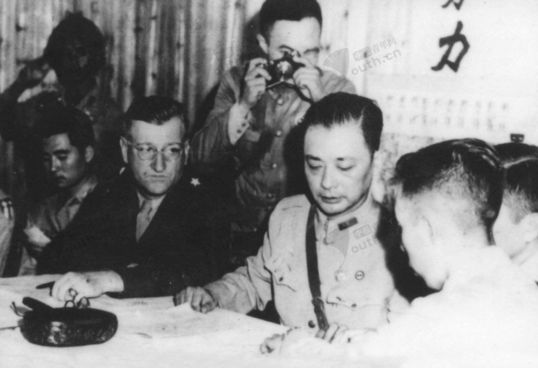 中国陆军总司令部参谋长、中国抗日名将萧毅肃中将等受降代表查看投降代表今井武夫身份的特别命令书(芷江抗战胜利受降纪念馆供图)