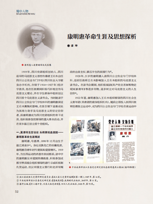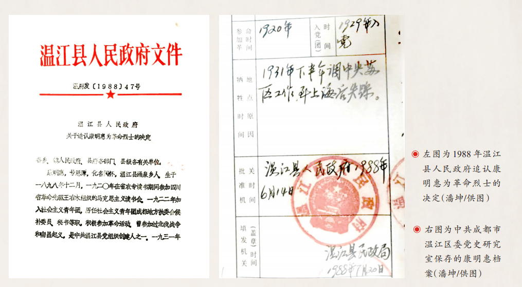 1925年,康明惠南下广州考入黄埔军校第四期工兵科③。当国民党右派分子在黄埔军校内活动猖獗时,康明惠不顾威逼利诱,坚定地加入到周恩来组织领导的“青年军人联合会”,坚决同右派分子展开斗争。黄埔军校毕业后,康明惠被分配到国民革命军第四军任工兵排长,并随部参加北伐战争。国民大革命失败后,康明惠继续随部队参加八一南昌起义。1927年底,康明惠因所在部队发生叛乱而被迫与党组织失去联系,他返回家乡温江继续开展革命工作,并在此期间创立温江历史上首个党组织。返回温江的康明惠为了革命工作,常奔走于成都、温江两地积极开展联络与组织工作,其活动引起反动当局注意,导致他的党员身份也暴露。1931年,反动当局开始大肆搜捕康明惠,为保护其生命安全,省委决定派康明惠前往江西苏区从事军事工作。同年11月,康明惠赴江西苏区前暂住上海,其间他以“悯怀”为名,向党中央作《关于四川政治经济状况的报告》,文中分析了当时四川经济政治形势,并对党内“立三路线”的错误进行批评,旗帜鲜明地指出应对敌开展武装斗争,并提出党组织首先要加强无产阶级领导,肃清阶级异己分子;其次要社会化;最后要职业化等三点建议。不久,康明惠在离开上海前往江西苏区的途中失踪,后被判定为牺牲。1988年,康明惠被追认为革命烈士。