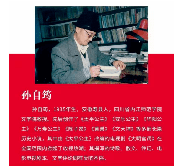 随着《孙自筠文集》的出版,孙自筠又成了媒体聚焦报道的对象。这距上一次他的《太平公主》改编为《大明宫词》的火爆隔了20余年。20多年来,他拒绝外面的喧嚣,沉醉于写作的世界,创作出了《华阳公主》《安乐公主》《万寿公主》《唐宫谣》《陈子昂》《黄巢》(与高卫红合著)《文天祥》(与孙迅合著)等历史小说。他以不变的情怀坚守文学,圆了青年时候的作家梦。