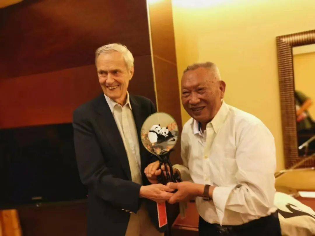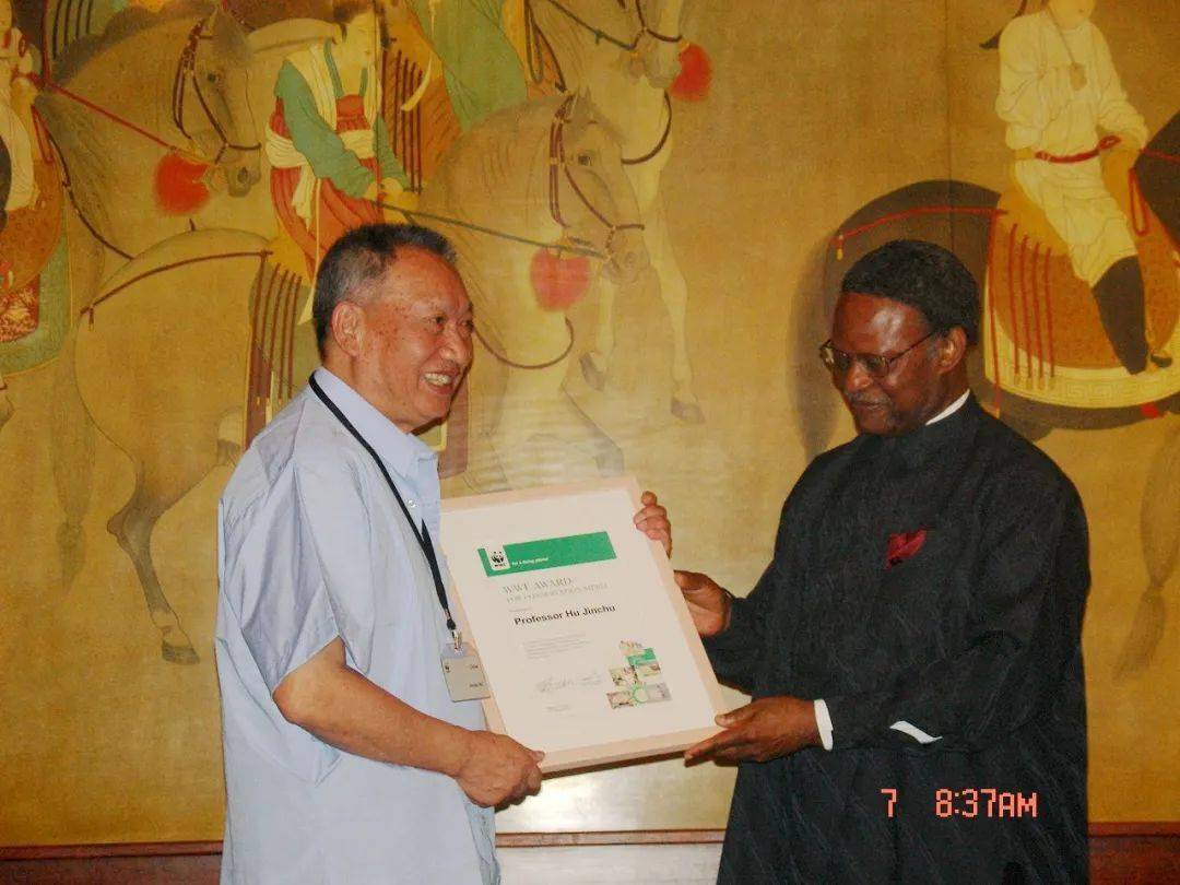 世界自然基金会主席(右)为胡锦矗教授颁奖(图片来源:西华师范大学网)