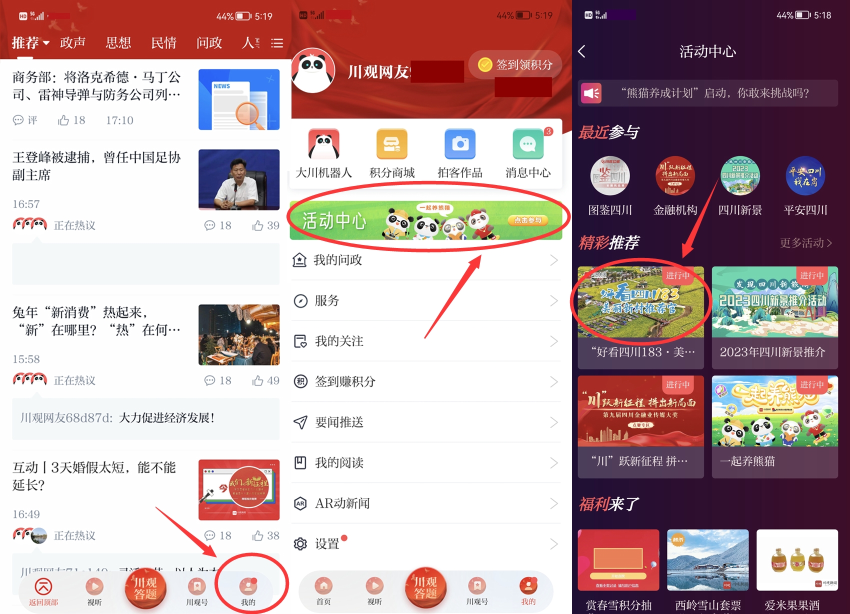 【第二步】在川观新闻首页,“我的”版块,点击“活动中心”,找到“好看四川183·美丽新村推荐官”活动图片,点击参与活动。