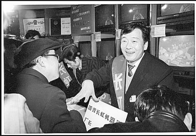 1993年,倪润峰(右)在销售卖场给消费者推介长虹彩电(新华社 发)