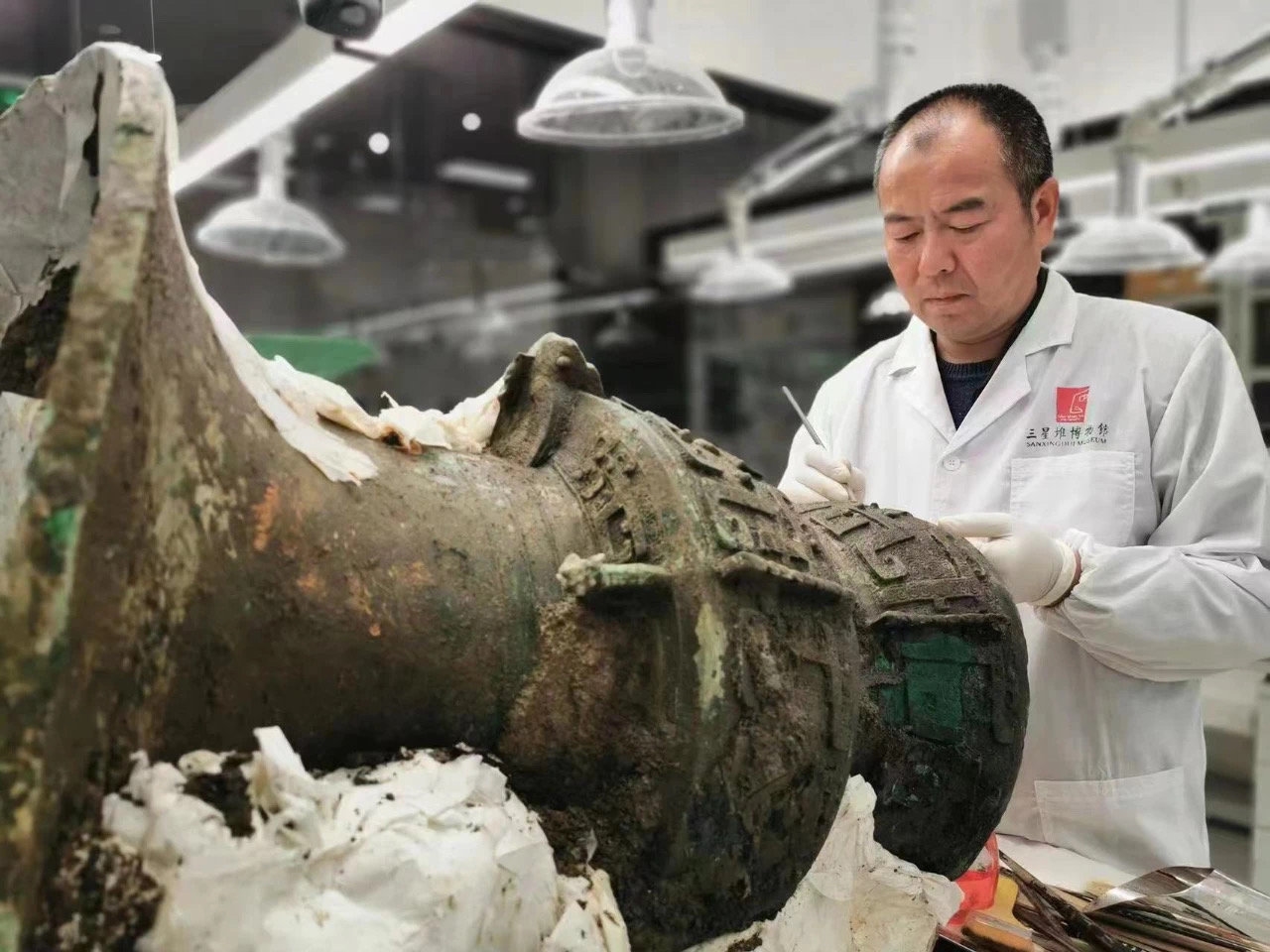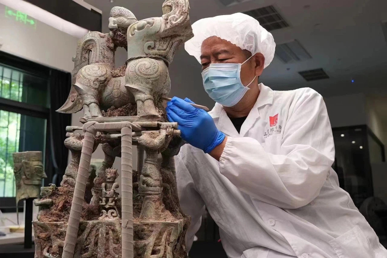 当时,师徒二人守着一间二三十平方米的小办公室,在数千个日夜里分类、拼合、焊接、雕刻,共计完成了六千余件文物的修复工作,其中就包括目前在三星堆博物馆内陈列的青铜神树、青铜大立人像、青铜大面具、戴金面罩青铜人头像等。