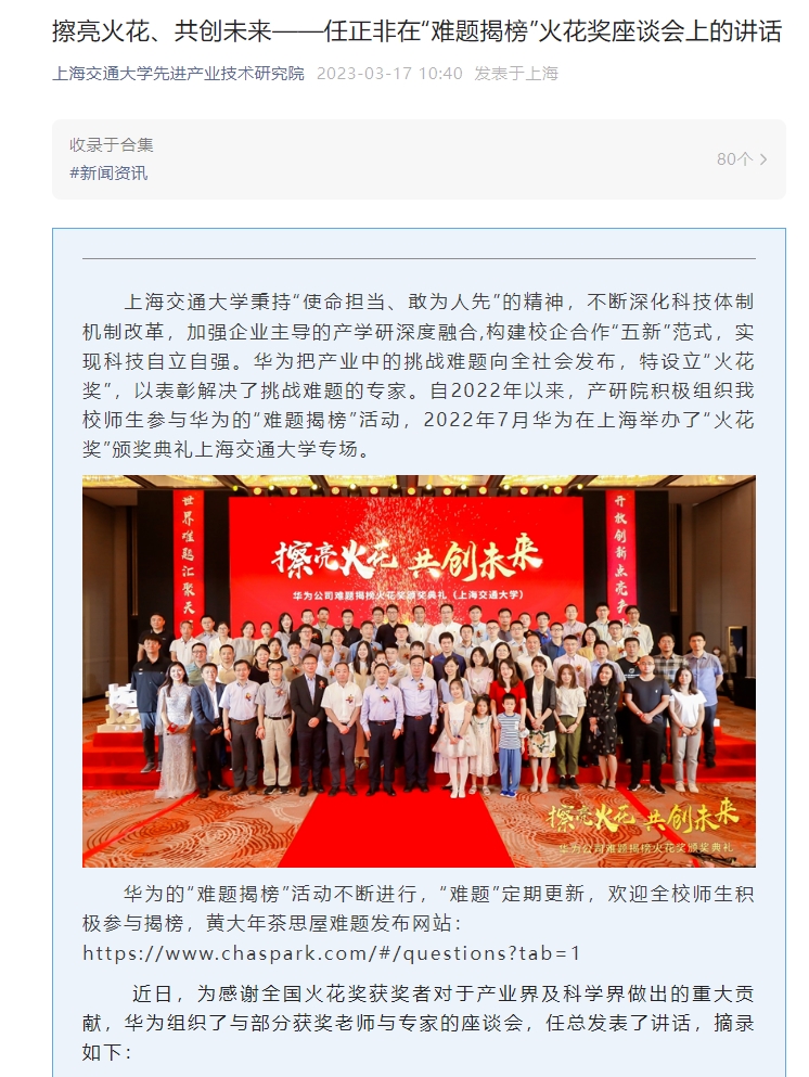 3月17日,上海交通大学发布了文章《擦亮花火、共创未来——任正非在“难题揭榜”花火奖座谈会上的讲话》,披露了华为创始人任正非对天才少年、校企合作等热点话题的看法,并剧透了华为2022年研发投入情况。