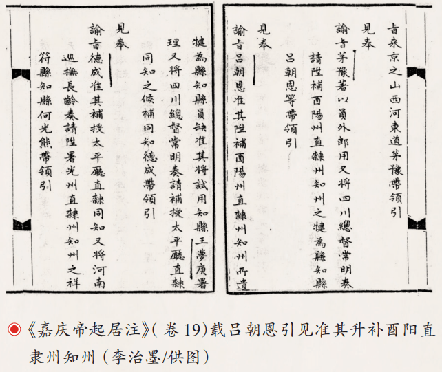 “……十七年(1812,吕朝恩)擢授(酉阳直隶州知州),未到任”(《酉阳直隶州总志》卷12·职官志)。为了这次擢任,吕朝恩再次进京觐见,“(六月十三日)又将四川总督常明奏请升补酉阳州直隶州知州之犍为县知县吕朝恩等带领引见,奉谕旨吕朝恩准其升补酉阳州直隶州知州”(《嘉庆帝起居注》卷17)。《总志》介绍吕朝恩为“顺天宛平进士”,实为不确;“未到任(酉阳)”则属实,原因仍是吕朝恩又在调办军务之中。他究竟什么时候离开犍为不详,但是直到嘉庆十八年正月二十一日,还有就犍为新开盐井纳税一事,朝廷给嘉定府知府宋鸣琦、犍为县知县吕朝恩的批复(台北故宫《数位典藏与数位学习联合目录》)。