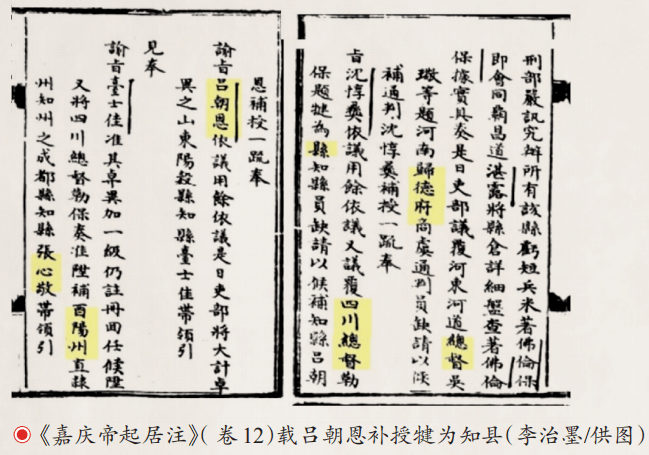 清嘉庆十二年(1807)4月28日,四川总督管巡抚事勒保奏报“犍为县知县程尚濂患病解任调理,经臣于嘉庆十二年三月初三日具题,开缺所遗员缺系冲难中缺,应归部选。经臣声明川省现有应补人员,容俟拣员另行请补在案。兹据布政使董教增、按察使姚令仪详查,有候补知县吕朝恩,年力壮盛,办事勤奋,堪以题补犍为县知县等情。前来臣覆查吕朝恩才具明练,办事勤干,以之题补犍为县知县,实堪胜任。该员系曾经得缺引见奉旨仍发四川以知县补用之员,今题补知县衔缺相当,毋庸另请实授,亦毋庸送部引见,谨题请旨”。批红:“该部议奏”(《明清档案》A326—119贴黄)。“又议复四川总督勒保题犍为知县缺,请以候补知县吕朝恩补,谕旨吕朝恩依议用”(《嘉庆帝起居注》卷12)。虽调任犍为,吕朝恩实际上仍分身两处,多数时间还在凉山抚彝军务中,直到2年后才全职回任。